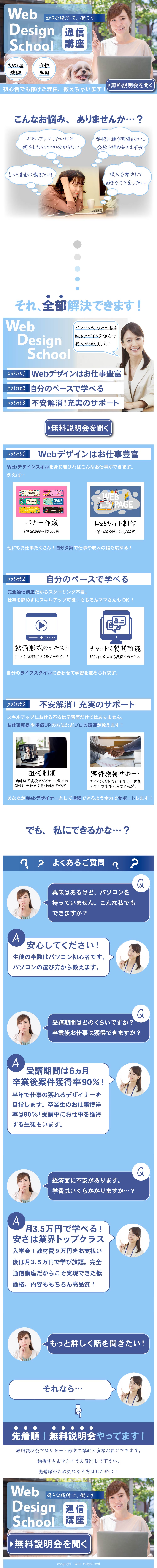 コンセプト:架空のWebデザインスクールのLPデザイン。ゴシック体フォントと水色をメインに使用し、読みやすさと清潔感を意識しました。今回は女性専用スクールですが、老若男女問わずスクール系の広告にお使いいただけるデザインです。