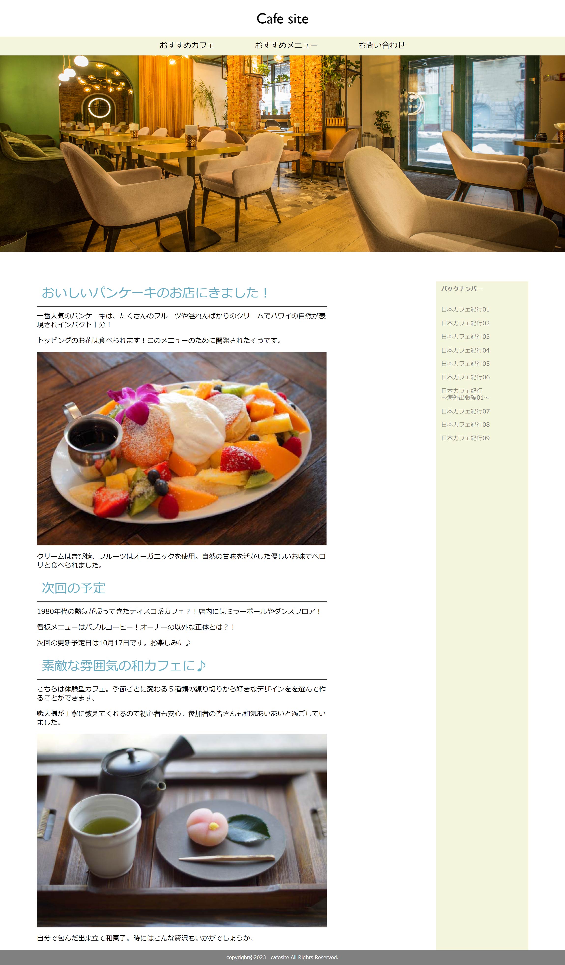 コンセプト:日本全国のカフェめぐりをしているブロガーの運営ブログをイメージ。ベージュを主なアクセントカラーに用い、カフェにいるような落着きとリラックス感を演出しました。