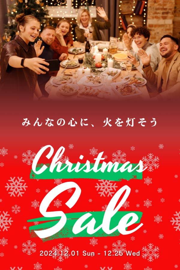 コンセプト:架空のショッピングモールのクリスマスセール告知をイメージしたバナー。家族でクリスマスの食卓を囲む暖かさをイメージし、手書き風フォントと明るめの赤をメインに使用。窓の外の冬景色を雪の結晶で表現しました。